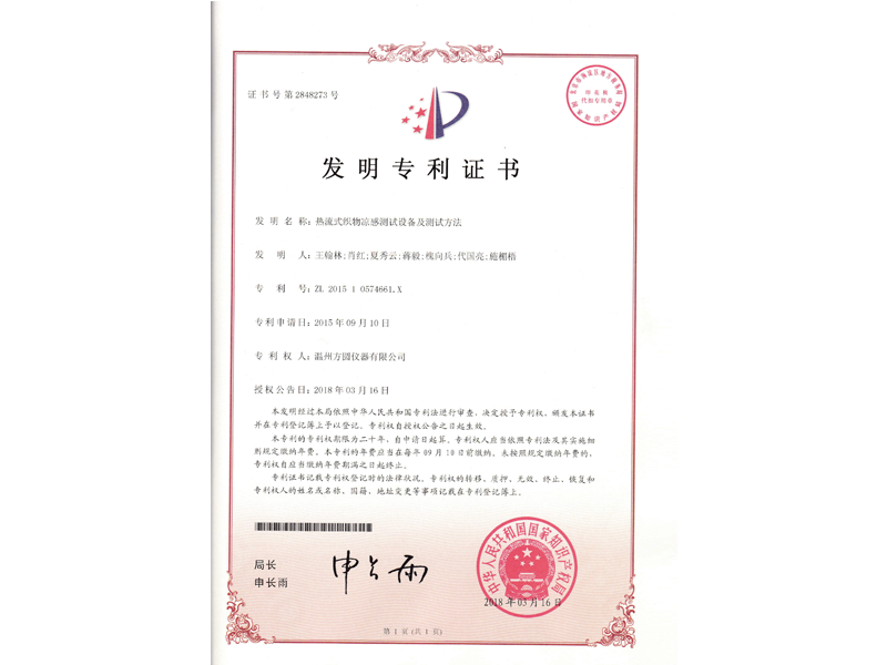 中國發(fā)明專利:熱流式織物涼感測試設(shè)備及測試方法(ZL 2015 1 0574661.X)