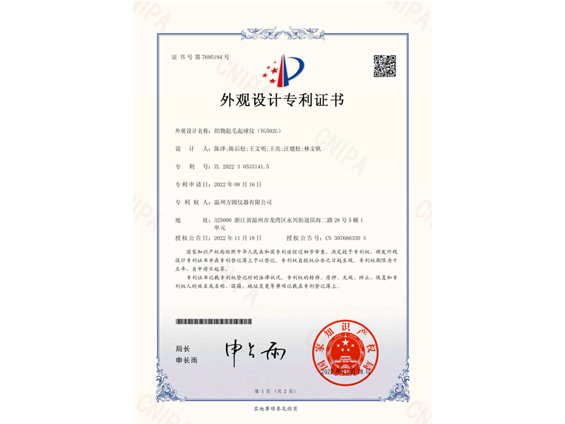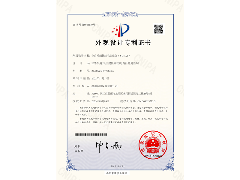 中國外觀設(shè)計專利:全自動織物起毛起球儀(ZL 2022 3 0777831.5)