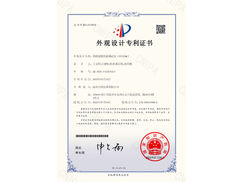 中國外觀設(shè)計專利:熱阻濕阻性能測試儀(ZL 2023 3 0121765.0)