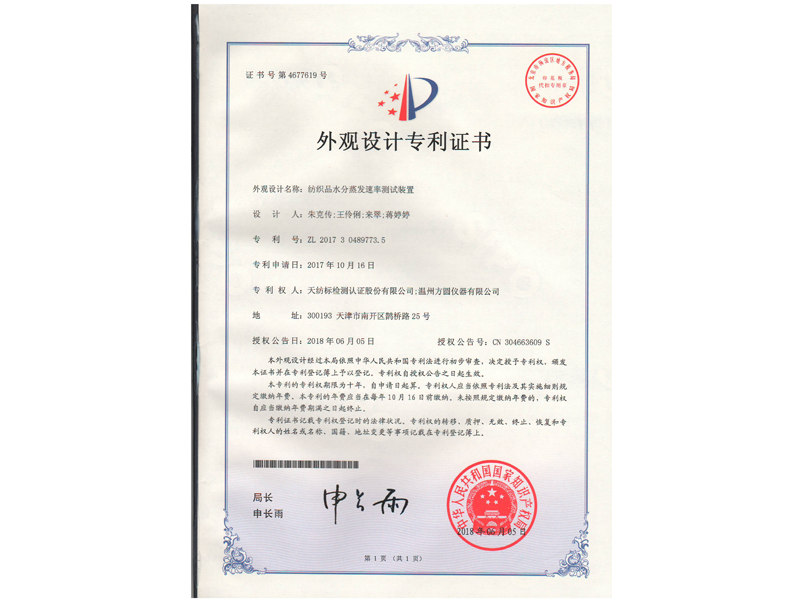 中國外觀設(shè)計專利:紡織品水分蒸發(fā)速率測試裝置(ZL 2017 3 0489773.5)