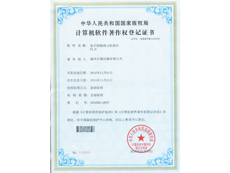 中華人民共和國國家版權(quán)局 計算機軟件著作權(quán)登記證書:電子織物強力機軟件V1.0(軟著登字第1297554號)