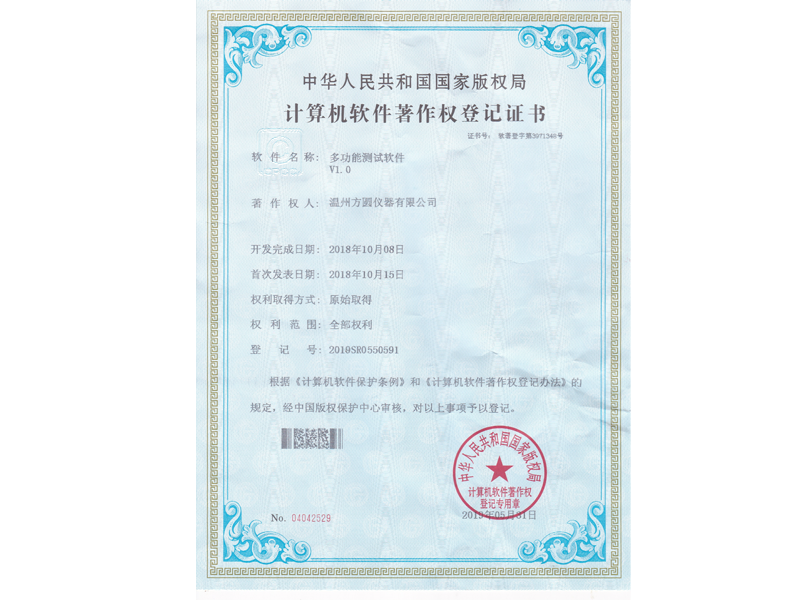 中華人民共和國國家版權(quán)局 計算機軟件著作權(quán)登記證書:多功能測試軟件V1.0(軟著登字第3071348號)