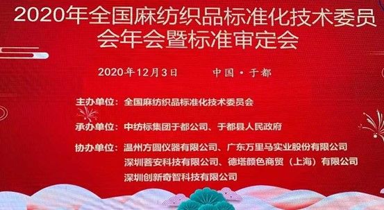 2020年12月3日, 全國麻紡織品標(biāo)準(zhǔn)化技術(shù)委員會第四屆第四次委員代表大會在江西·于都順利召開。本屆大會由全國麻紡織品標(biāo)準(zhǔn)化技術(shù)委員會主辦,中紡標(biāo)集團于都公司、于都縣人民政府承辦,溫州方圓儀器有限公司、廣東萬里馬實業(yè)股份有限公司、深圳菩安科技有限公司、德塔顏色商貿(mào)(上海)有限公司、深圳創(chuàng)新奇智科技有限公司協(xié)辦。