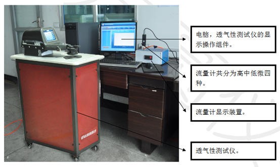 工作原理:當試樣正反兩面達到規(guī)定的壓差時,測試單位時間內(nèi)垂直流過試樣一定面積的氣流流量。